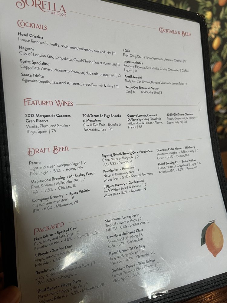 Welcome to Sorella, a delightful Italian eatery in Milwaukee that masterfully balances a casual vibe with a touch of elegance, making it perfect for any occasion. Nestled at 2535 S Kinnickinnic Ave, the menu is a culinary journey that begins with tantalizing antipasti like Roasted Broccoli with Apricot and Mussels Oreganata, designed to awaken your palate.
